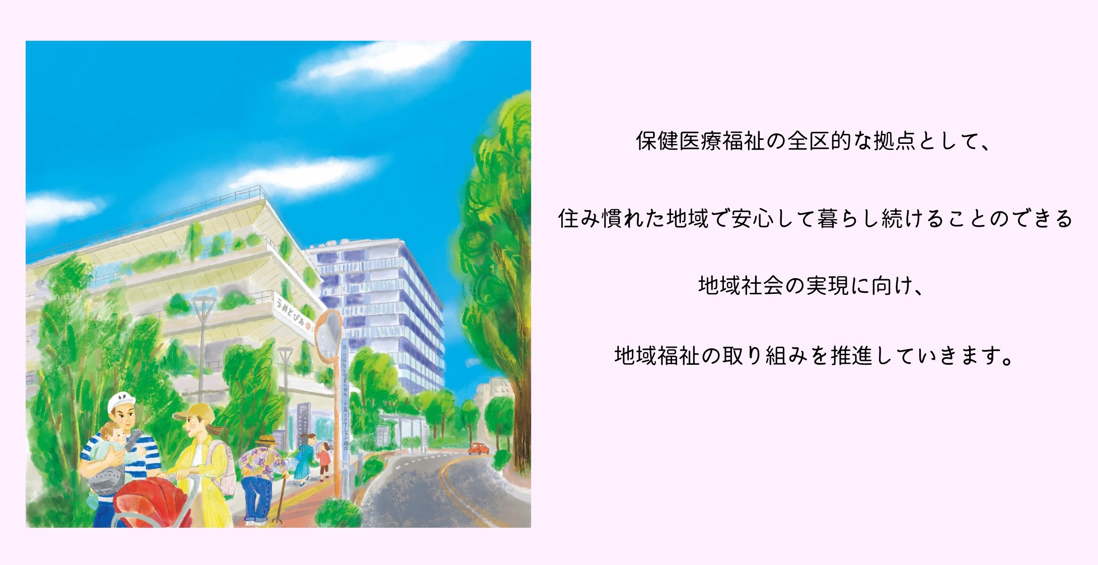 「うめとぴあ」は保健医療福祉の全区的な拠点として、住み慣れた地域で安心して暮らし続けることのできる地域社会の実現に向け、地域福祉の取り組みを推進していきます。