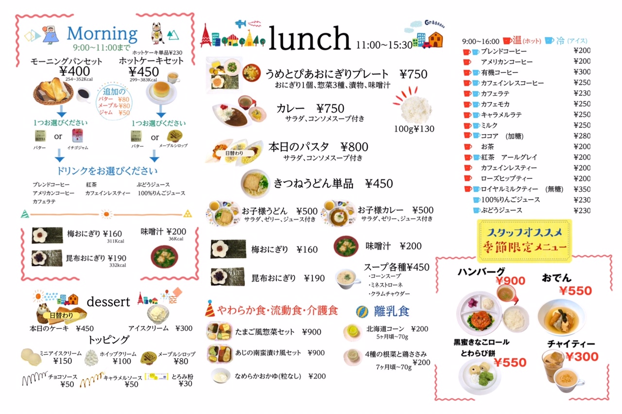 - 日常の食事から介護食(やわらか食、離乳食)まで豊富なメニューをご用意し、あらゆる世代の地域の皆様に安心・安全な食事を提供いたします。