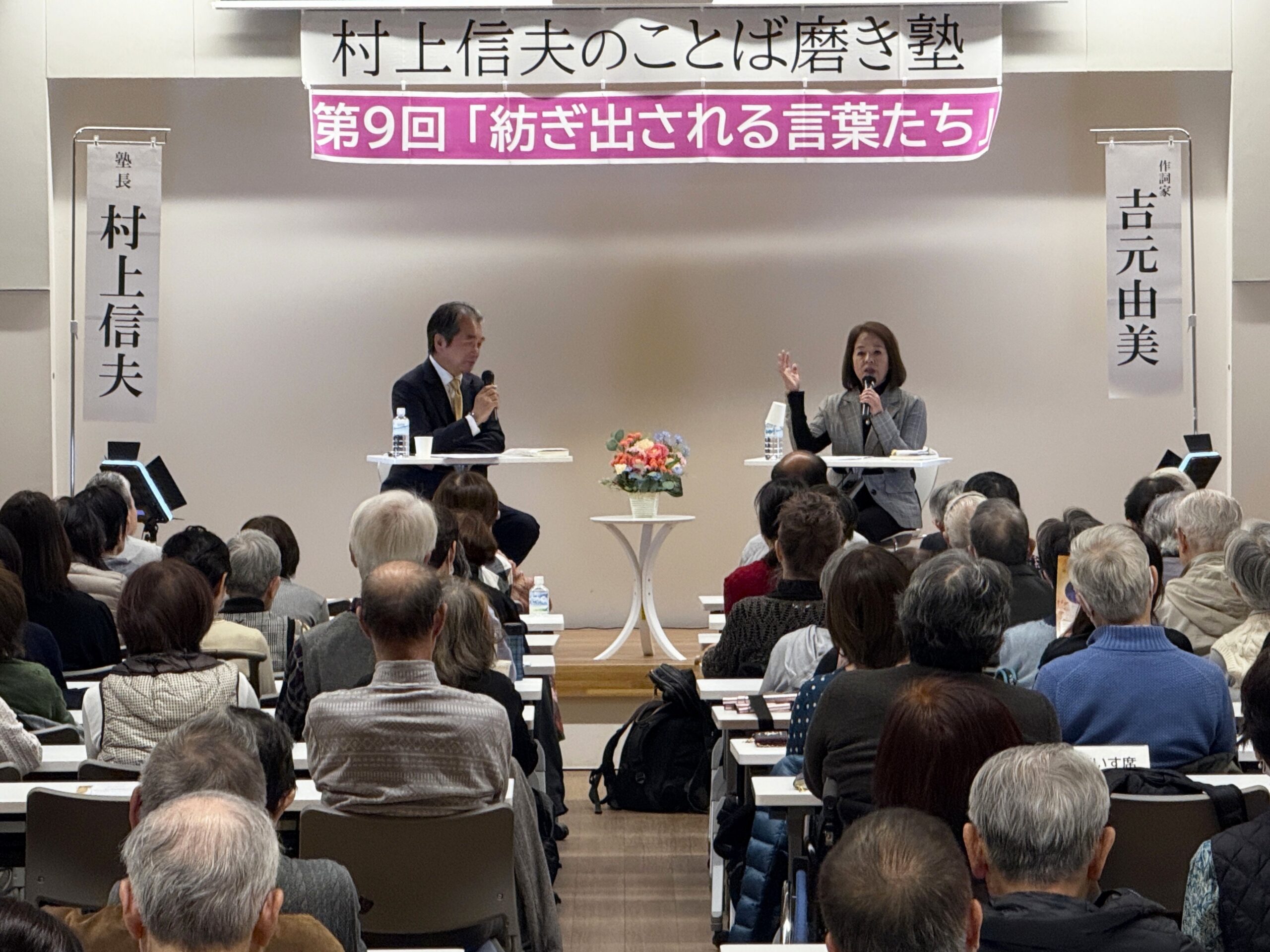 令和7年11月15日、ゲストに作詞家・作家の吉元由美さんをお迎えして「第9回 村上信夫のことば磨き塾」を開催しました。