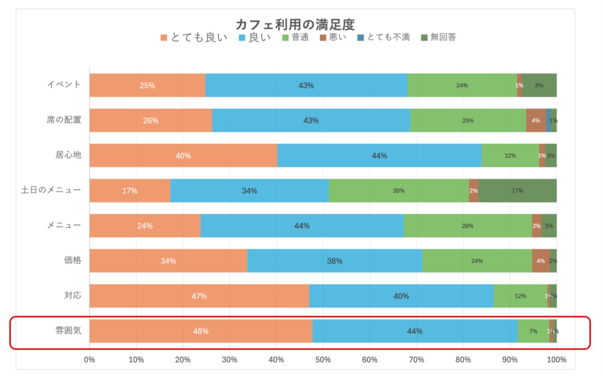 カフェ利用の満足度は、居心地、スタッフの対応、雰囲気などが高評価