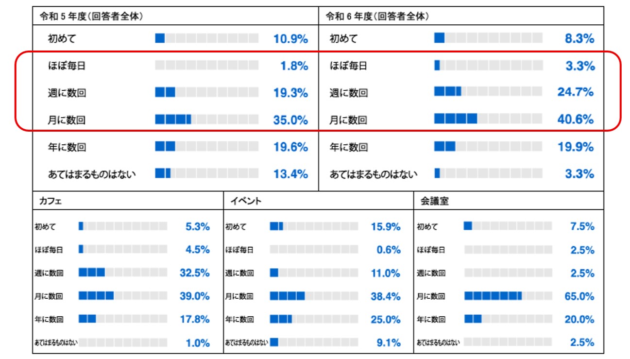 回答者の来館頻度を見ると、前年度に比べて「初めて」の回答が減り「ほぼ毎日」「週に数回」「月に数回」の回答が増えました。「とても良い環境でリラックスできる」「無料のイベント企画があり、楽しみにしている」「手作りショップがあって楽しい。カフェがよい」などの声が多数挙がり、利用者の定着が伺えます。