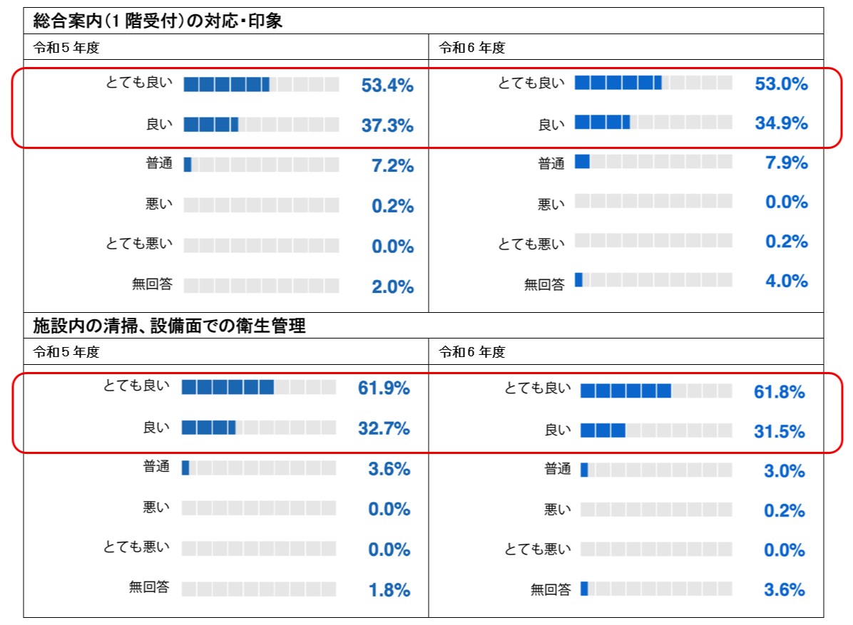 総合案内の対応や印象、施設内の清掃、設備面での衛生管理が引き続き高評価